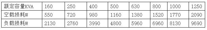 干式變壓器技術(shù)參數(shù)有:①頻率50Hz,②空載電琉,要求少于4%,③低壓耐壓強(qiáng)度:2KV/min無(wú)擊穿,④絕緣電阻低壓側(cè)不少于2MΩ,⑤繞組連接方式:/Y/yn0,與D/yn0 ,⑥線圈允許溫升100K,⑦散熱方式:自然風(fēng)冷或溫控風(fēng)冷,⑧噪聲系數(shù)小于30dB。各種容量干式變壓器(SCB型)損耗參數(shù)如表1所示。