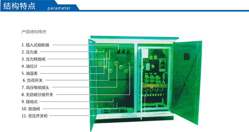 該產(chǎn)品將高壓負(fù)荷開關(guān)、高壓熔斷器置于變壓器油中,具有與變壓器器身共箱或分箱兩種結(jié)構(gòu)形式。油箱采用全密封結(jié)構(gòu),配有油溫表、油位表、壓力表、壓力釋放閥、放油閥等元件以監(jiān)測變壓器運(yùn)行狀況。該產(chǎn)品分為環(huán)網(wǎng)型、終端型及電源型供電方式。為了使此種產(chǎn)品更適合于我電網(wǎng)的實(shí)際要求,公司又推了插拔型干式熔斷器,熔絲的熔斷不影響變壓器油的性能。根據(jù)低壓饋出要求的復(fù)雜程度,YBM-12/0.4型產(chǎn)品分為標(biāo)準(zhǔn)型、加強(qiáng)型和綜合型三種外殼形式,使用戶和設(shè)計(jì)單位在選型時(shí),做到更靈活、更經(jīng)濟(jì)。